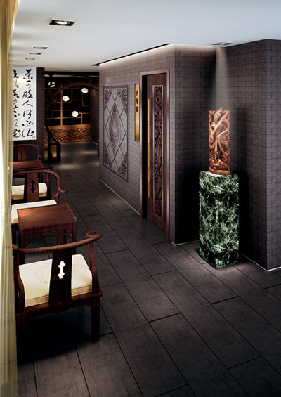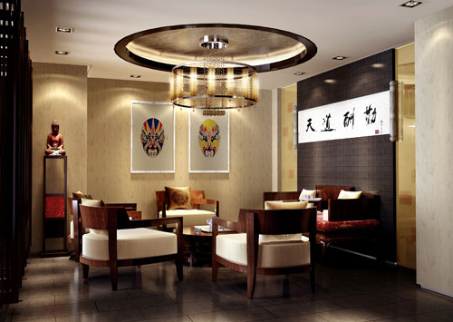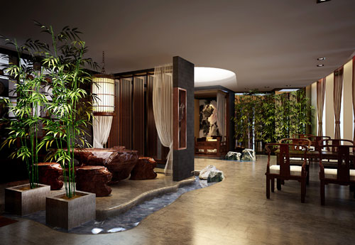 整體空間設計以現代中式風格全程演繹“韻品茗香似甘露、吉閑靜雅悠然中”。在鬧市中營造出“世外桃源”般的清馨,安靜之所。處處滲透著中式裝修文化藝術的精髓。 在設計中以“還有無心者、閑尋此境來,鳥幽聲忽斷、茶好味重回”。從中提煉“幽”“閑”“靜”“思”的概念來營造茶文化的氛圍。