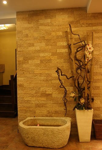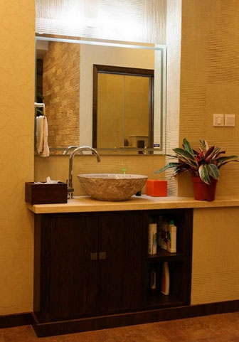 木質(zhì)玄關(guān)衣柜,墻邊的藝術(shù)盆景,旁邊的石質(zhì)小水盆很有時代感。很喜歡這個盆景,纏繞的根非常有韻味。