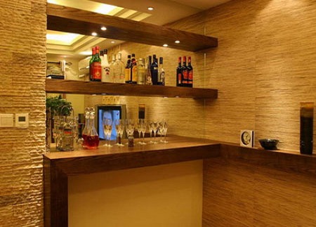 雙層酒柜吧臺配合玻璃客廳隔斷,很好的體現(xiàn)了主人的品味。也更好地利用了空間,一定的裝飾效果使得它更顯完美。